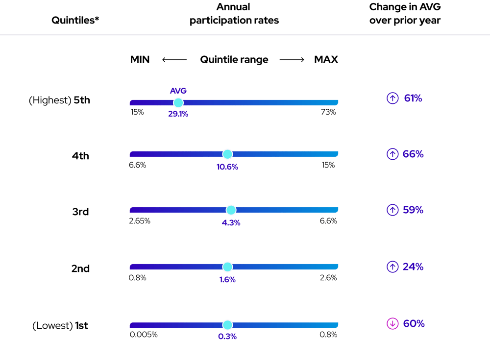 While volunteering participation has increased exponentially, a closer look at participation rates by quintile indicates considerable variation across companies. The top performing quintile has a wide range in participation from 15% to 73%.